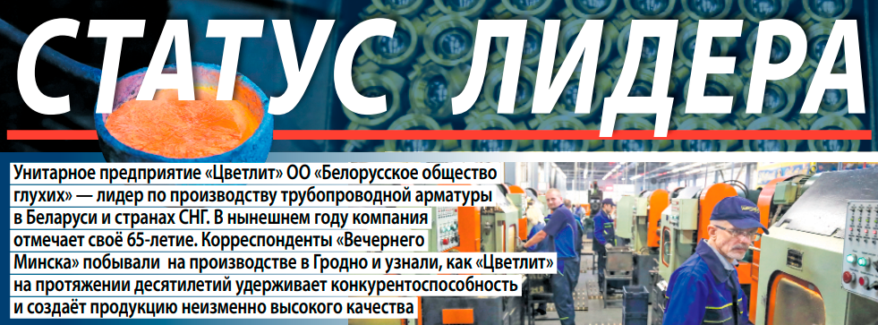 Унитарное предприятие «ЦВЕТЛИТ» – это компания с 60-летним опытом работы, на которой производится трубопроводная арматура различного назначения. Мы являемся крупнейшим Белорусским производителем арматуры для систем водоснабжения, газоснабжения, отопления и пожарно-технических систем. Основными продуктами являются клапаны запорные, клапаны обратные, шаровые краны, регуляторы давления, оборудование для систем отопления, фитинги, фильтры, пожарно-техническая продукция.