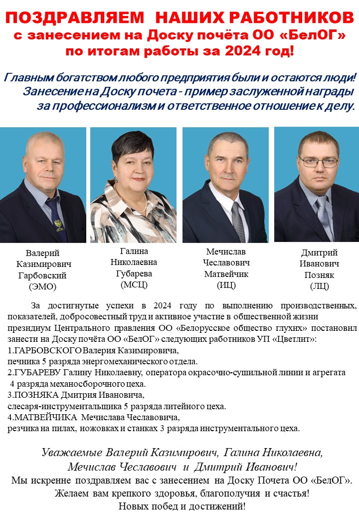 За достигнутые успехи в 2023 году в работе и активное участие в общественной жизни коллектива занесены на Доску почета Центрального правления Белорусского общества глухих 4 работника предприятия: -Барцевич Владимир Вячеславович, сверловщик МСЦ -Кузьма Аркадий Александрович, оператор металлорежущих станков-автоматов МСЦ -Крупица Анна Владимировна, резьбонарезчик на специальных станках МСЦ -Гресь Елена Эдуардовна, штамповщик литейного цеха!