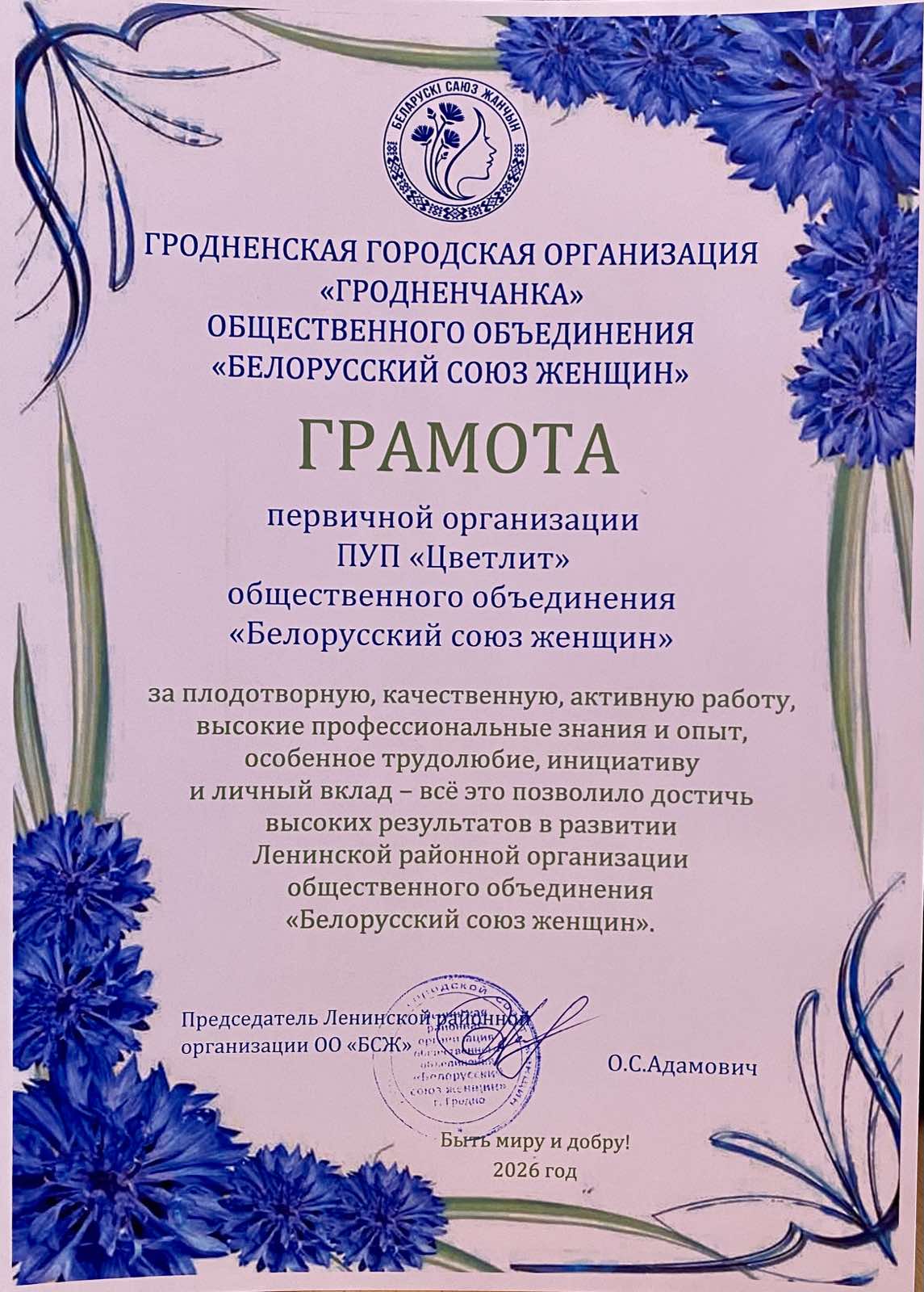 Первичная организация УП «Цветлит» ОО «БСЖ» была награждена Грамотой Ленинской районной организации ОО «БСЖ» за активную и плодотворную работу по итогам 2025 года!