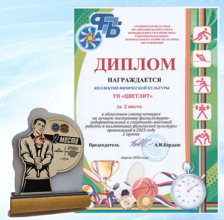 Подведены итоги областного смотра-конкурса на лучшую физкультурно-оздоровительную и спортивную работу за 2025 год. 2 место присуждено коллективу физической культуры Первичной профсоюзной организации Унитарного предприятия «Цветлит».